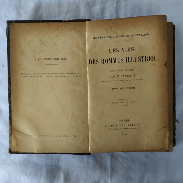 • Le livres Ceuvres Complètes de Plutarque "Les Vies des Hommes Illustres Tome 2. Traduites em français, Par E. Talbot - Tome Deuxiéme, Cinquiéme Édition - Paris 1912. Librairie Hachette Et Cie . 79 Boulevard Saint-Germain, 79. Tradução: O livro Obras Completas de Plutarco "As Vidas dos Homens Ilustres volume 2. Traduzido para o francês, por E. Talbot - Volume Segundo, Quinta Edição - Paris 1912. Librairie Hachette Et Cie. 79 Boulevard Saint-Germain, 79. Livro em frances com mais de 110 anos de existência, encadernação antiga, capa dura com pequeno dano, vendido no estado. Livro diferenciado DE COLEÇÃO PARTICULAR. Este exemplar de colecionador apresenta marcas do tempo e manuseio.