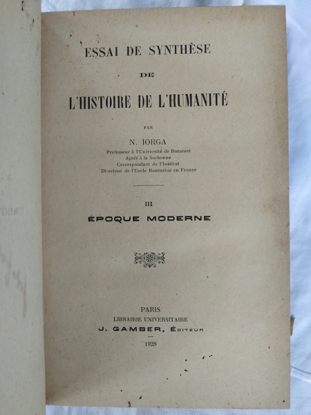 • Le livre Essai de synthèse de L'histoire de L'humanité. III Époque Moderne, Paris 1928. Librairie Universitaire, J. Gamber - Éditeur. Tradução: O livro ensaio de síntese da História d humanidade. III Época moderna, Paris 1928. Livraria da Universidade, J. Gamber - Editora. Livro em frances com quase 100 anos de existência, encadernação antiga, capa dura com pequeno dano, vendido no estado. Livro diferenciado DE COLEÇÃO PARTICULAR. Este exemplar de colecionador apresenta marcas do tempo e manuseio.