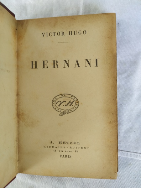 • Le livre "Hernani" Victor Hugo, J. Hetzel - Libraire Éditeurs. 18 Rue Jacob, 18 Paris. EDITORA LITERÁRIA E ARTÍSTICA. 1906. Tradutor: O livro "Hernani" de Victor Hugo, J. Hetzel - Editora Livreira. Rua Jacob, 18, 18 Paris. EDITORA LITERÁRIA E ARTÍSTICA. 1906. Literaturas das línguas românicas. Literatura francesa. Livro em frances com mais de 115 anos de existência, encadernação antiga, capa dura com pequeno dano, vendido no estado. Livro diferenciado DE COLEÇÃO PARTICULAR. Este exemplar de colecionador apresenta marcas do tempo e manuseio.
