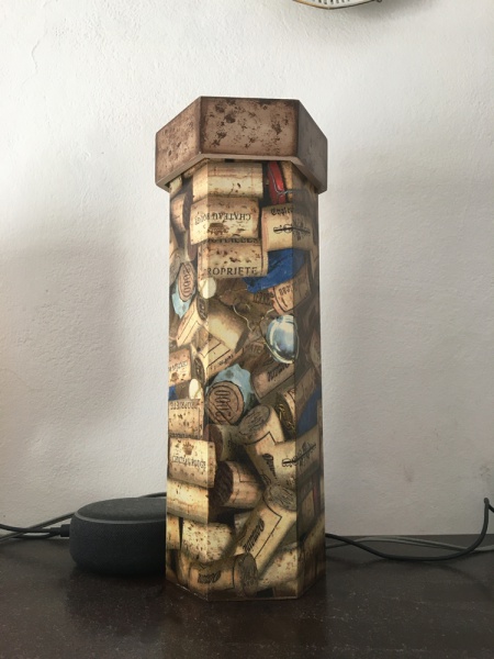 • Porta garrafa para vinho, sextavado, decorado com imagens de rolhas.
