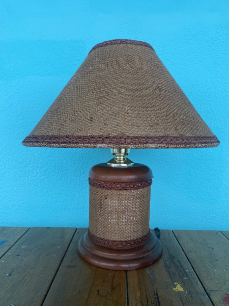 • Abajur de mesa, feito de madeira funcionando. DImensões: 30 cm aproximadamente.