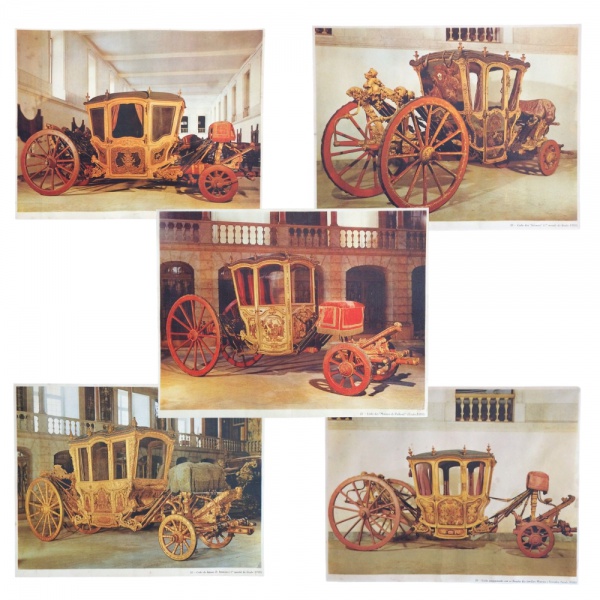 • Lote com cinco antigas reproduções de carruagens -  n.º 15  -  Coche do Infante D. Francisco (1.º quartel do Século XVIII), n.º 19 - Coche ornamentado com os brasões das famílias Menezes e Noronha (Século XVIII), n.º 20 - Coche das "Infantas" (1.º metade do Século XVIII), n.º 21 - Coche dos "Meninos de Palhavã" (Século XVIII), n.º 13 - Coche da "Mesa" (Século XVIII). Exemplares parte de coleção e em excelente estado. Dimensões: 22 cm x 28,5 cm.