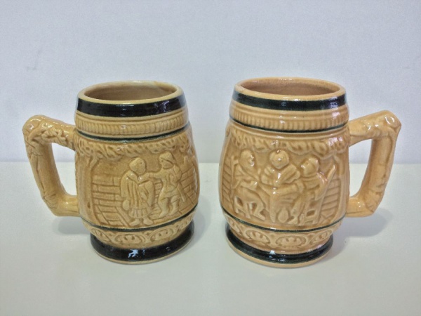 • Duas antigas Canecas em Porcelana Mauá, anos 50,  com imagens de Cotidiano em alto relevo. Selo de Manufatura e numeração marcados no fundo. Dimensões: 12 cm x 13 cm.