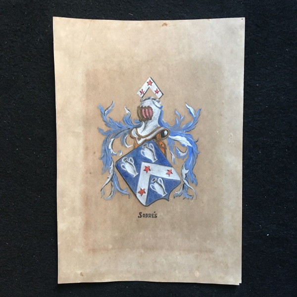• Antiga pintura à mão "BRASÃO SODRÉS" em tons de azul e cinza cintilante. Emoldurada. Sinais de marcas do tempo na moldura. Dimensões: 30,5 cm x 25,5 cm.