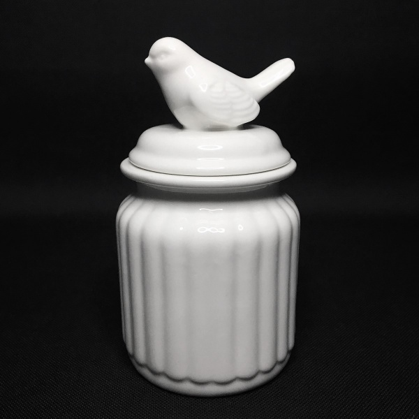 • Belo pote em cerâmica esmaltada na cor branca com detalhes canelados. Tampa com pega em forma de pássaro. Exemplar em excelente estado. Dimensões: 14 cm  x 8 cm diâmetro.