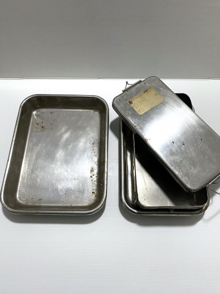 • Estojo e bandeja em aço inox para instrumentos cirúrgicos. Presença de desgastes. Dimensões: 32 cm x 24 cm x 4 cm (medida da bandeja)