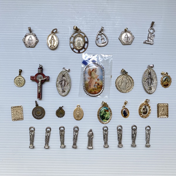 • Lote com pingentes e santinhos de metal. Total 30 peças.