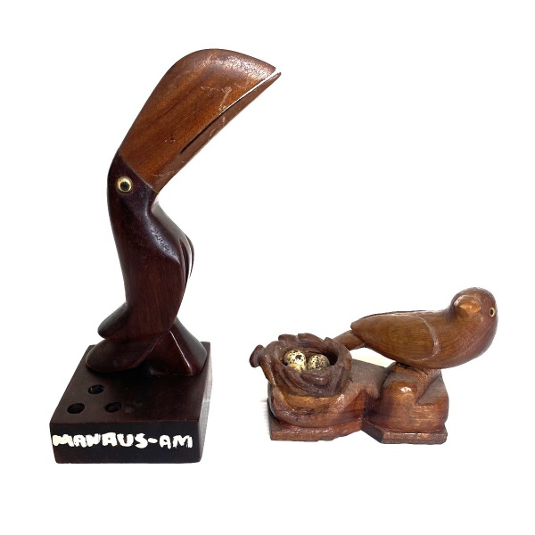 • Lote com duas aves de madeira. Dimensões: 20 cm (maior peça).