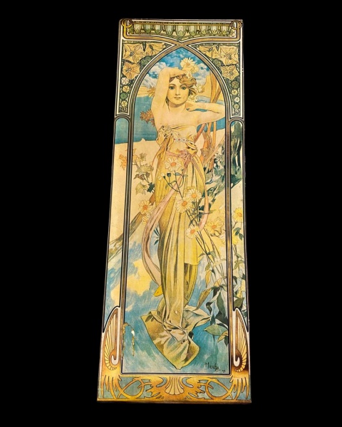 • Mucha - Antiga impressão fixada em quadro de eucatex. Dimensões: 100 cm x 35 cm.