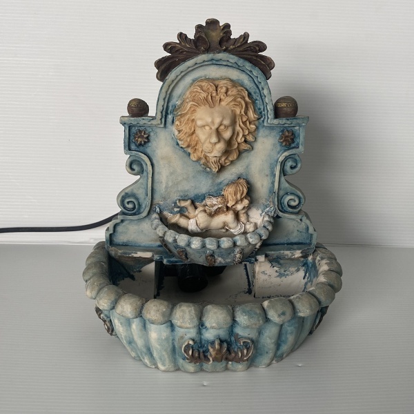 • Fonte de água, decorativa, de resina, decorado com cabeça de leão e querubim. Funcionando. Dimensões:23 cm x 18 cm x 20 cm.