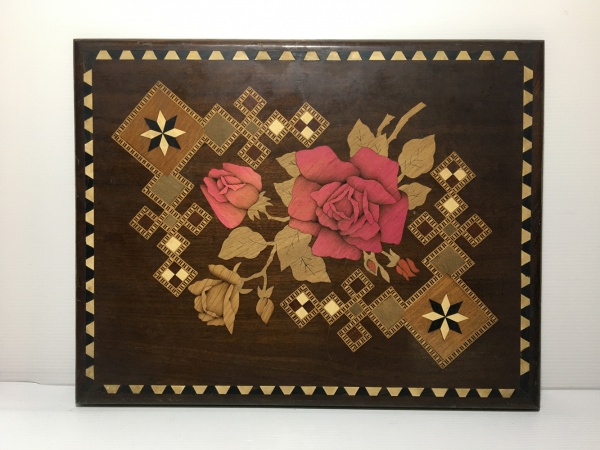 • Antiga placa de  madeira marchetada, decorada com arranjo floral e faixa geometrica. Dimensões: 30 cm x 38 cm.