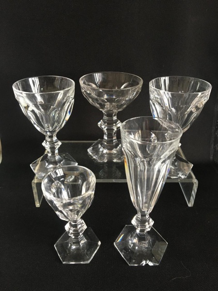 • BACCARAT - Parte de coleção com cinco taças de cristal , com selo gravado no fundo. Base dos exemplares com bicado conforme fotos. Dimensões: 17,5 cm (maior taça).