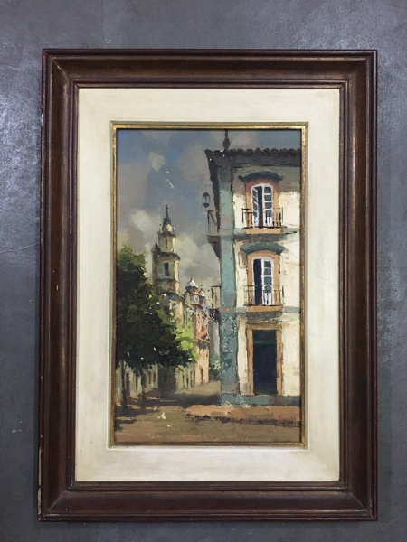 • Óleo sobre tela Casario emoldurado. Presença de falhas na pintura. Dimensões: 60 cm x 40 cm.