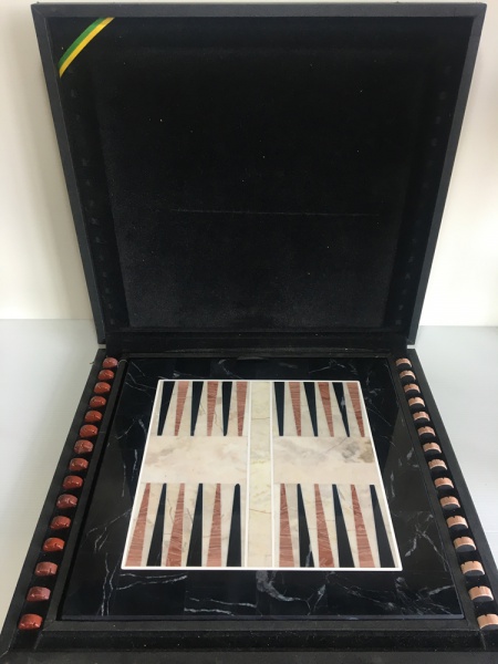 • Antigo tabuleiro para gamão feito em mármore. Completo. Acompanha maleta com sinais de desgastes. Dimensões: 37 cm x 35 cm.