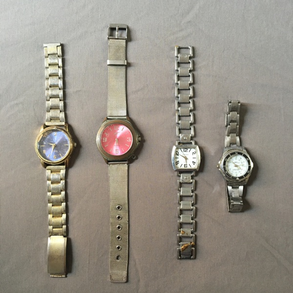 • Lote com 4 relógios sendo um sem vidro e um com os ponteiros soltos. Todos os exemplares sem funcionamento.