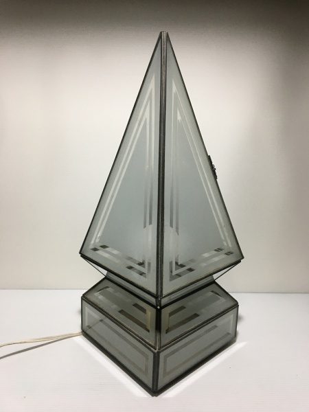 • Luminária de mesa no formato de pirâmide com armação de metal e placas de vidro. Dimensões: 42 cm altura.