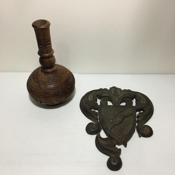 • Vaso e aplique em madeira talhada com belos detalhes. Dimensões: 22 cm (vaso). Aplique falta uma parte.