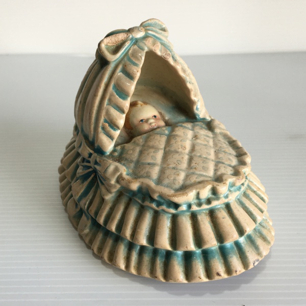 • COIMBA - PORTUGAL - Antiga estatueta de bebê no berço em cerâmica policromada (apresenta sinais de desgastes). Dimensões: 8 cm altura.