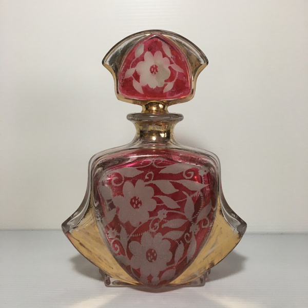 • Antigo frasco de vidro com tampa, anos 40, decorado com flores e detalhes pintados à ouro. Sinais de desgastes. Dimensões: 18 cm x 14 x 6 cm.