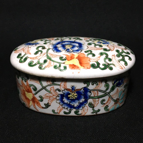 • Antigo porta-joias em porcelana esmaltada , decorado com flores e detalhes vegetalistas pintados à mão. Tampa restaurada. Falta parte da tampa na parte interior. Dimensões: 12 cm x 9 cm x 6 cm.