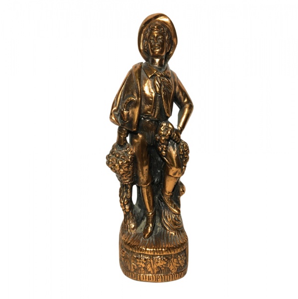 • Estatueta de comerciante de frutas em resina, revestida na cor cobre. Dimensões: 26 cm.