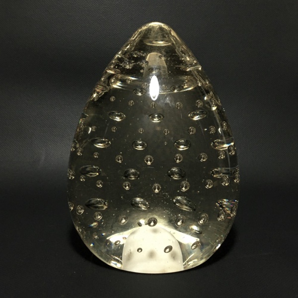 • Escultura em pasta de vidro, formato ovóide, decorada com micro bolhas no interior. Dimensões: 12 cm.