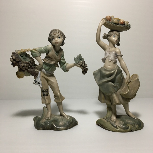 • Duas estatuetas "Jovens comerciantes de frutas" em resina. Dimensões: 18 cm (maior peça).