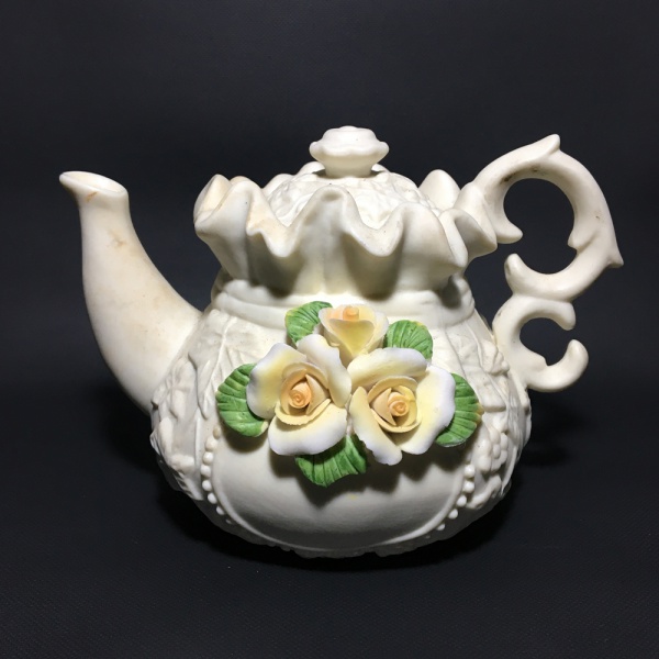 • Antigo bule de porcelana decorado com arranjos florais em alto relevo. Dimensões: 11 cm.
