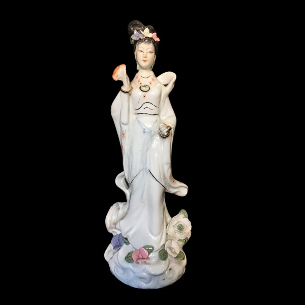 • CHINA - Escultura de Gueixa de porcelana esmaltada e policromadaDimensões: 40 cm de altura.