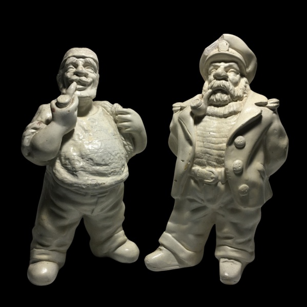 • Par de marujos feito de material pesado não identificado. Preseça de pequenos bicados. Peças numeradas. Dimensões: 25 cm / 1 Kg.