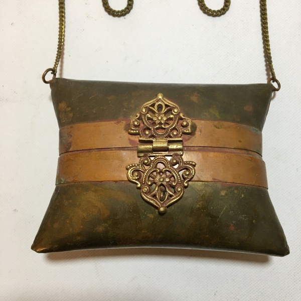 • ÍNDIA - Antiga bolsa totalmente feita de cobre e metal dourado . Dimensôes:12 cm x 9 cm x 5 cm.