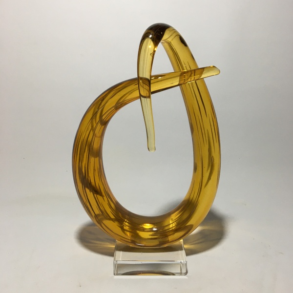 • MURANO - Antiga e bela estatueta abstrata em pasta de vidro  na cor amarelo e base de cristal translúcido. Presença de ínfimo bicado na quina da base. Dimensões: 27 cm x 17 cm.
