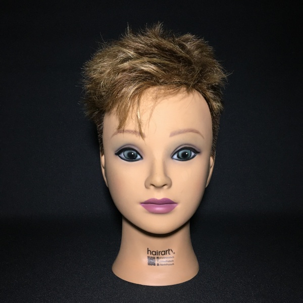 • HAIRART - Manequim para treino realístico, material rígido e emborrachado. Cabelo 100% humano. Presença de anotação à caneta no pescoço. Dimensões: 27 cm x 12 cm x 17 cm.