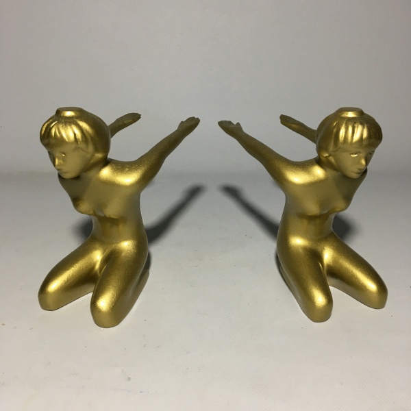 • Par de escultura em metal revestido de dourado. Dimensões: 13 cm x 15 cm x 7 cm / 2,5 kg.