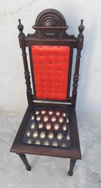 • Da Penha - Assemblage Queen Chicken - Linda cadeira vintage. "A cadeira dos ovos dourados".  Técnica mista. Assento resistente em acrílico de 4 milímetros. Assinada no verso.