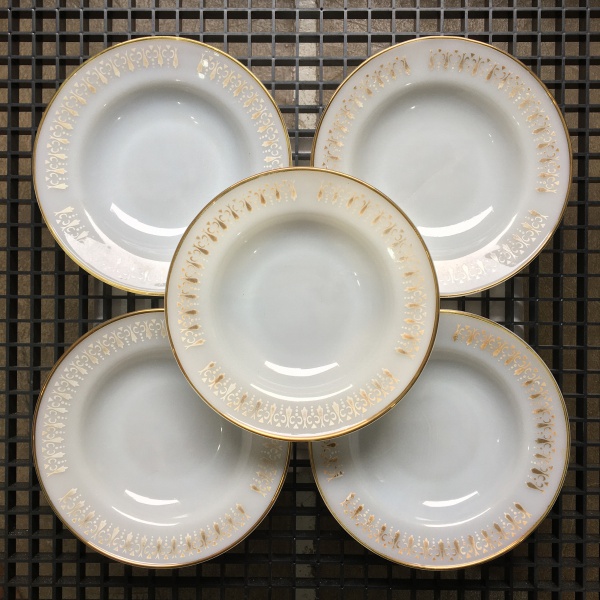 • THERMO REY - Cinco pratos fundos em vidro modelo gravatinha .Presença de sinais de uso. Dimensões: 22 cm