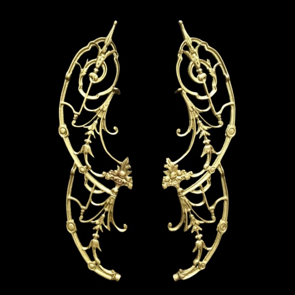 • Antigo e belo par de adornos em bronze revestido de dourado, estilo Luís XV, ornado com volutas, flores e estilizados. Ricos detalhes. Dimensões: 35 cm aproximadamente.