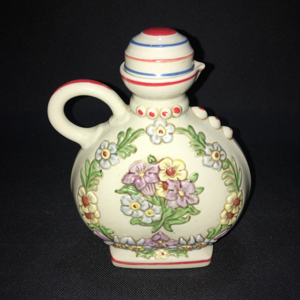 • CERAM ARTE - Bela e antiga garrafa em porcelana com tampa . desenhos  em alto relevo florais e ao centro casal  se beijando , outro lado da garrafa desenhos em alto relevo  florais e ao centro arranjo floral. Dimensões: 15,5 cm x 12 cm.