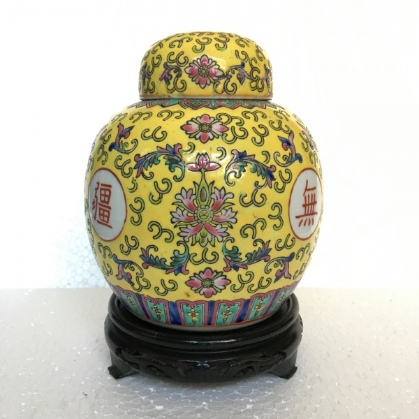 • CHINA - Belo potiche em porcelana esmaltada decorado com arabescos e elementos vegetalistas sobre fundo amarelo. Acompanha penhanha em madeira. Dimensões: 18 cm x 12 cm.