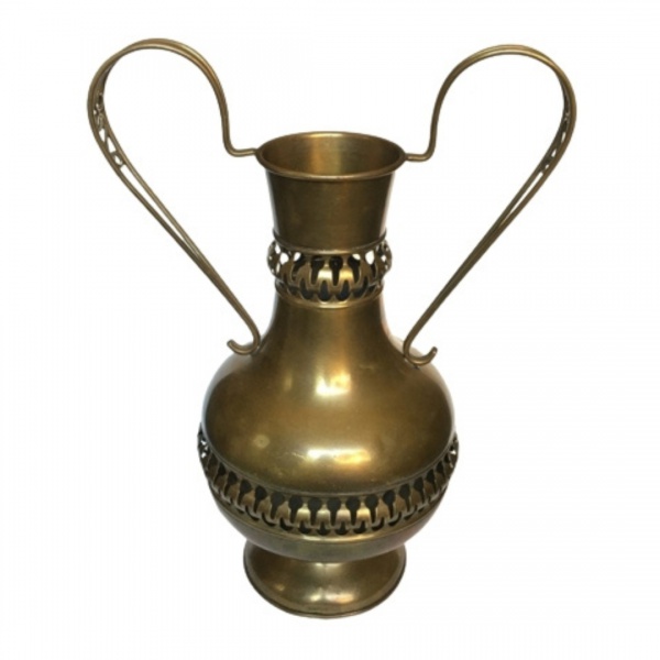 • MARCHETTI / PRATA 90 - Antigo e belo vaso em metal dourado e finestrado com belos detahes e alças trabalhadas.Bojo com pequene mossa. Dimensões: 36 cm x 27 cm x 15 cm.