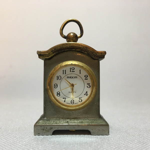 • Delicado relógio de mesa em miniatura de metal, funcionando. Dimensões: 5,5 cm x 3,5 cm x 2 cm.