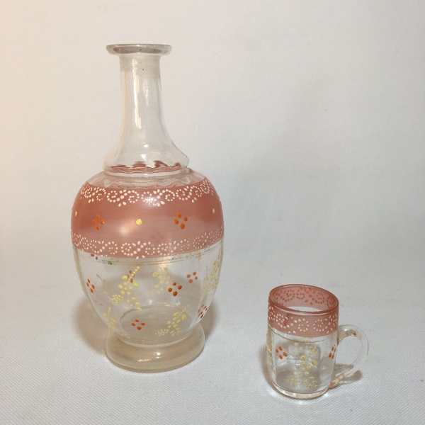 • Delicada garrafa em vidro com detalhes e perolados pintados a mão , acompanha 1 copo. Não possui tampa. Dimensões: 17 cm x 8 cm. / copo 5 cm.