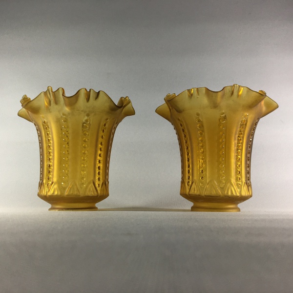 • Belo par de cúpulas em  vidro na cor âmbar decorado com perolados e bordas onduladas. Dimensões: 13 cm altura / abertura maior 14 cm / abertura menor 4,5 cm .