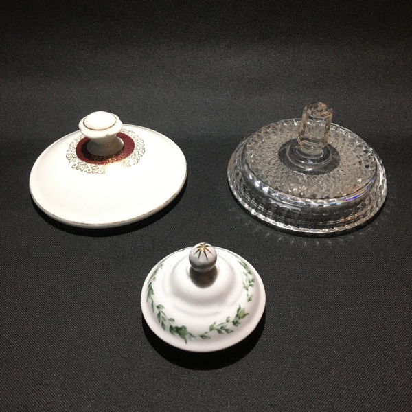 • Conjunto com 3 tampas, uma de cristal e duas de porcelana. Excelente estado. Dimensões: Maior tampa mede 14,5 cm e a menor 9 cm.