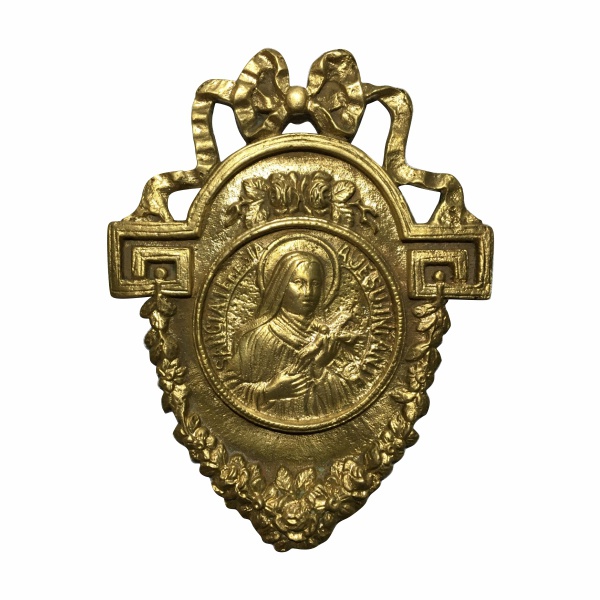 • Adorno em bronze decorado com florões, laçarotes e ao centro imagem da Santa Tereza De Jesus.Dimensões:14 cm x 10,5 cm / 280grs.