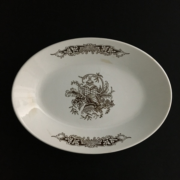• NADIR FIGUEIREDO - Antiga travessa em cerâmica esmaltada decorada com arranjos florais e estilizado na cor marrom. Pequenos sinais de desgastes.Dimensões: 20 cm x 28 cm.