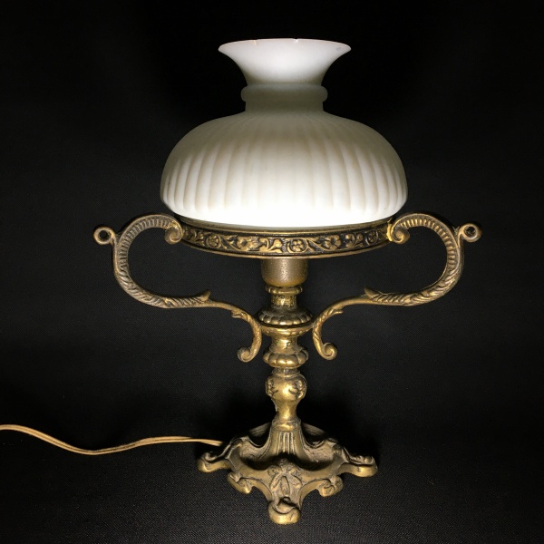 • Antigo e belo abajour em bronze decorado com arranjos florais , alças volutadas e cúpula em vidro satinado na cor barnca. Cúpula com pequenos bicados na parte superior. Dimensões : 29 cm x 22 cm.