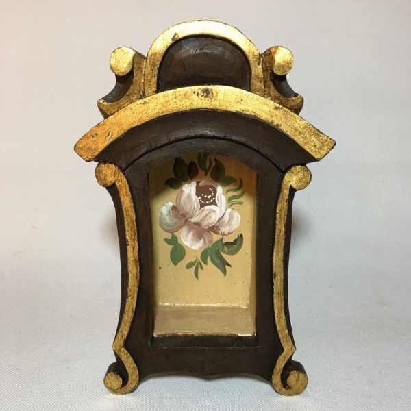 • Delicado oratório em madeira decorado com volutas , detalhes em dourado e na parte interna flores pintadas a mão. Dimensões: 21 cm x 13 cm x 6 cm.