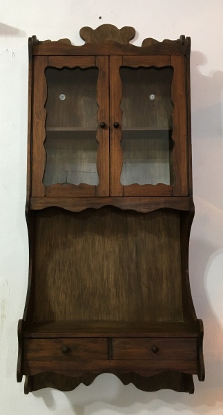 • Antiga e delicada estante de parede em madeira com prateleira, porta de vidro e 2 gavetas na parte inferior. Exemplar em excelente estado. Dimensões: 99 cm x 44 cm x 18 cm.