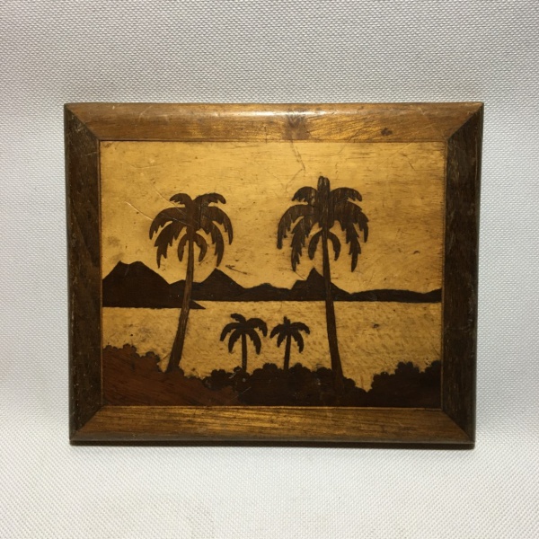 • Antiga placa de madeira marchetada com figura de paisagem. Dimensões: 14 cm x 16 cm x 1 cm.